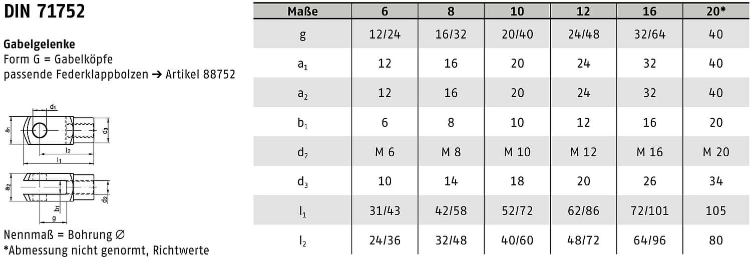 DIN 71752 definiert Maße, Toleranzen, Gewindegrößen und Bohrungsabmessungen für Gabelköpfe. Die internationale ISO 8140 sorgt für Kompatibilität und Austauschbarkeit weltweit. Die verzinkte Stahl-Variante erfüllt diese Normen und gewährleistet eine zuverlässige, standardkonforme Verbindungslösung.