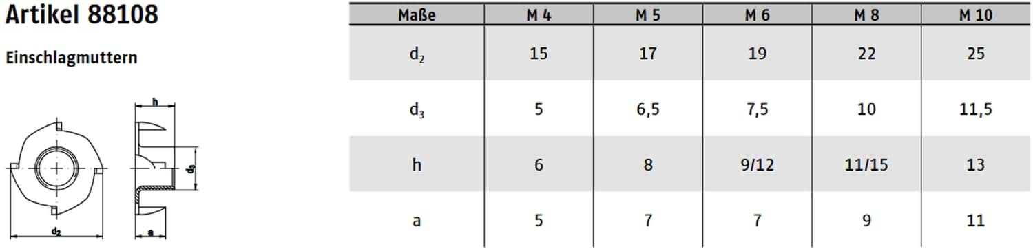 Einschlagmuttern nach ART 88108 aus Stahl verzinkt schaffen in Holz, Spanplatten und MDF belastbare Innengewinde. Durch Einschlagen in eine vorgebohrte Öffnung verankern sich die Krallen sicher im Material und verhindern ein Mitdrehen beim Verschrauben.