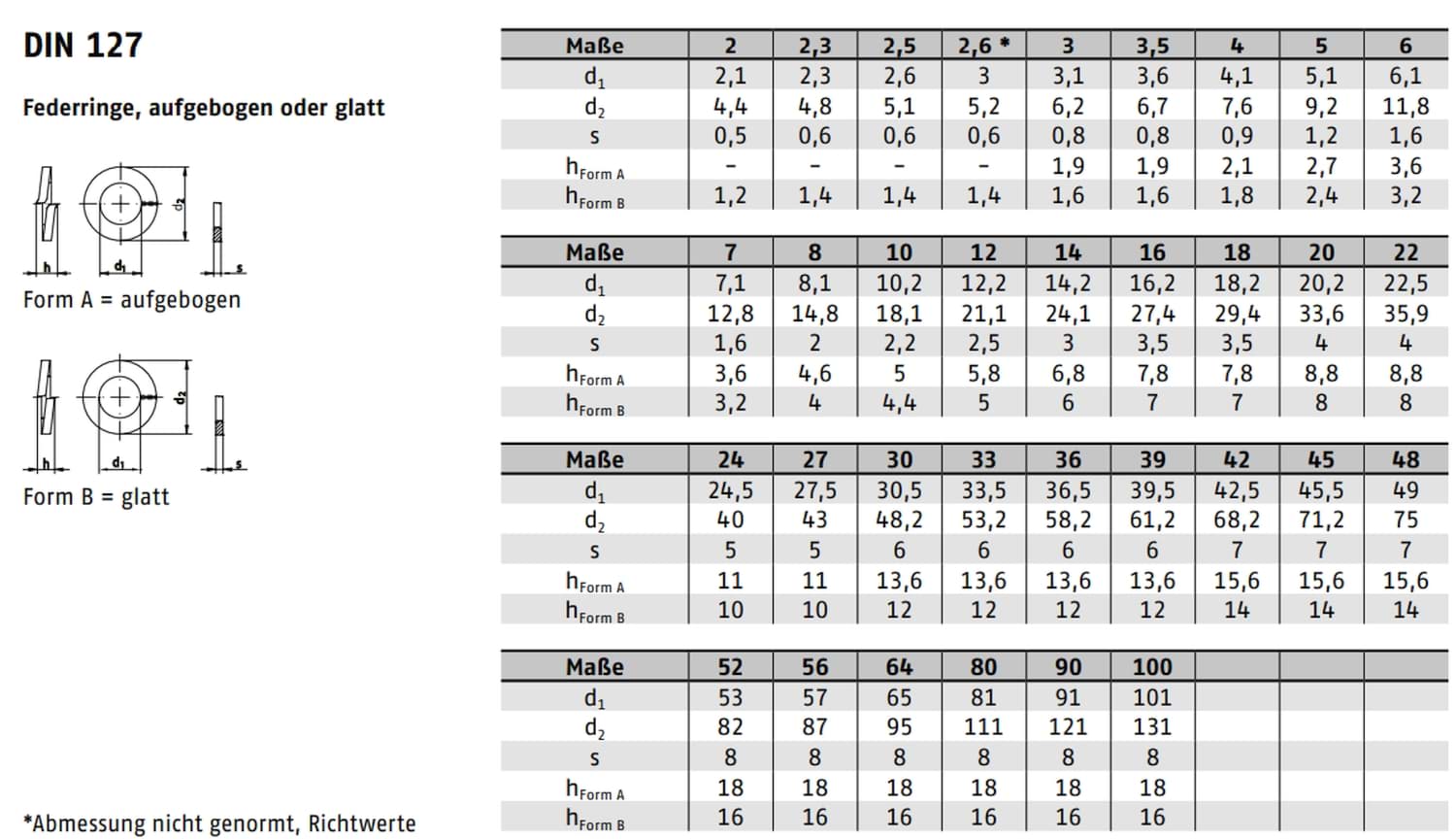 Die Norm DIN 127 umfasst sowohl Form A (gerade Schnittenden) als auch Form B (versetzte bzw. leicht überlappende Enden). Beide Varianten dienen der Sicherung von Schraubverbindungen, wobei Form B durch die versetzte Geometrie eine etwas höhere elastische Vorspannung und damit eine verstärkte Sicherungswirkung bieten kann. In diesem Gruppenprodukt sind beide Formen (A und B) enthalten.