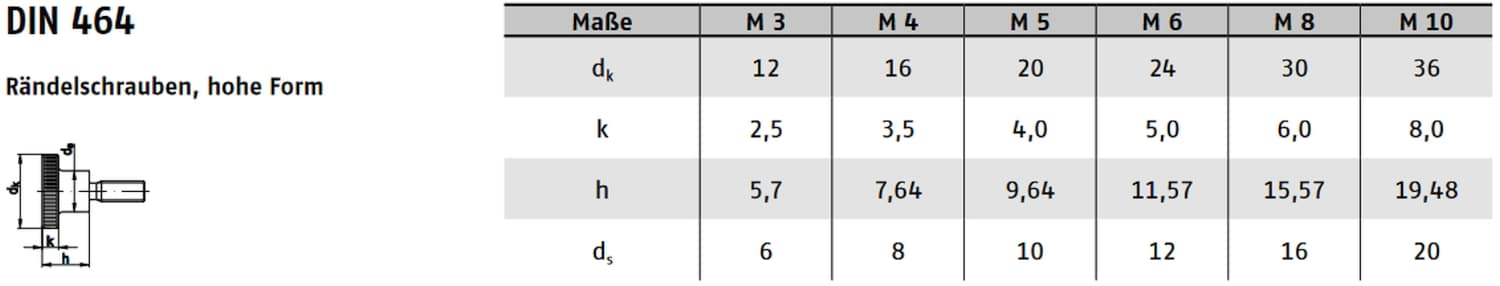 DIN 464 definiert Maße, Kopfform und Toleranzen von Rändelschrauben hoher Form. Die Norm stellt sicher, dass Rändelschrauben verschiedener Hersteller austauschbar sind und zuverlässig mit genormten Muttern und Gewinden kombiniert werden können.