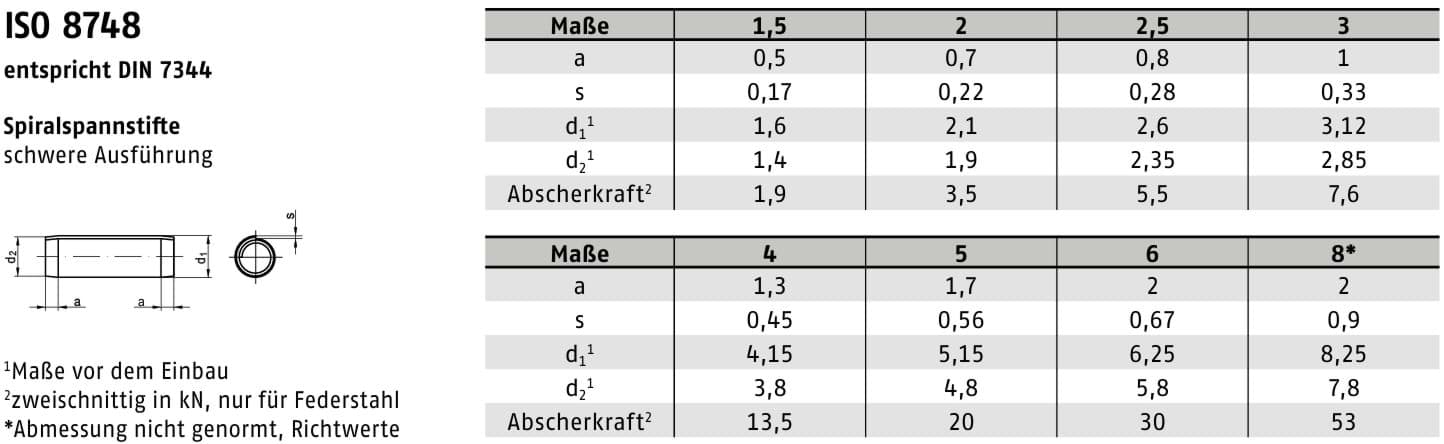 Die DIN 7344 definiert spiralgerollte Spannstifte mit erhöhter Belastbarkeit gegenüber klassischen Spannstiften nach DIN 1481. Sie wird bevorzugt eingesetzt, wenn hohe Scherkräfte und dynamische Beanspruchungen auftreten.