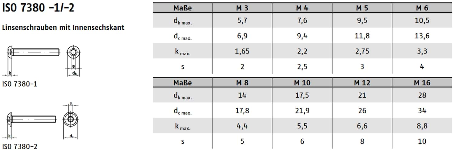 Linsenkopfschrauben nach DIN 7380-2 verfügen über einen flachen Linsenkopf mit integriertem Flansch und Innensechskant-Antrieb. Der Flansch vergrößert die Auflagefläche, reduziert die Flächenpressung auf das Bauteil und kann in vielen Anwendungen eine separate Unterlegscheibe ersetzen. Der integrierte Flansch schont die Bauteiloberfläche und sorgt für eine gleichmäßige Kraftverteilung – eine ideale Kombination aus Optik, Korrosionsschutz und Funktion.