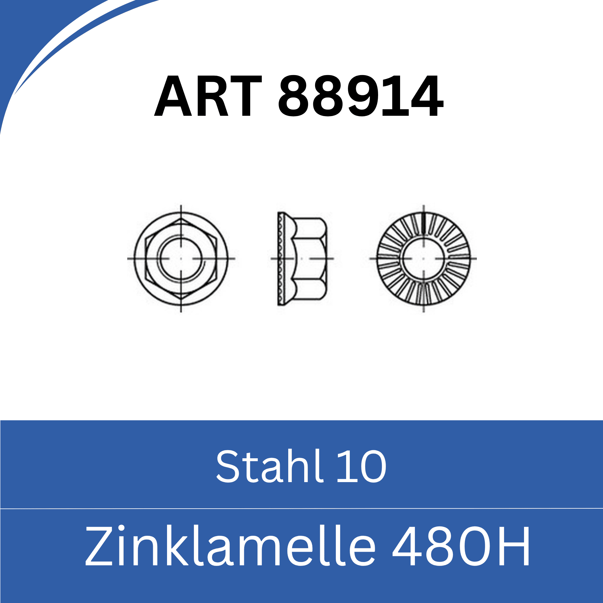 Artikel: ART 88914 – RIPP-Flanschmutter mit Sperr-Rippen. Werkstoff: Stahl 10 (hochfest). Oberfläche: galvanisch verzinkt gemäß DIN EN ISO 4042. Verbindungselement mit integrierter Sicherungsfunktion durch Profilierung.