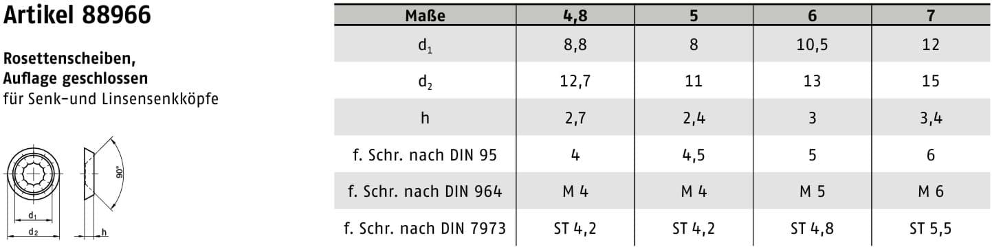 ART 88966 ist eine herstellerspezifische Rosettenscheibe mit definierten Abmessungen gemäß Datenblatt. Sie ist geeignet für Senk- und Linsensenkkopfschrauben nach DIN 95, DIN 964 und DIN 7973.