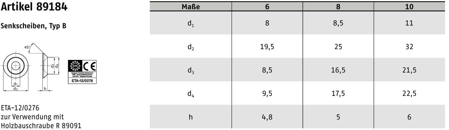 ART 89184 ist eine bewährte Spezialausführung für Holzbauschrauben und wird unter anderem in Kombination mit ETA-zugelassenen Schrauben eingesetzt. Die Abmessungen sind praxisgerecht auf gängige Schraubendurchmesser abgestimmt.