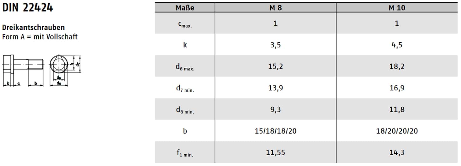 Die Schraube entspricht der Norm DIN 22424, welche Maß- und Formvorgaben für Dreikantsicherungsschrauben regelt. So ist eine standardisierte Produktion und Austauschbarkeit sichergestellt.