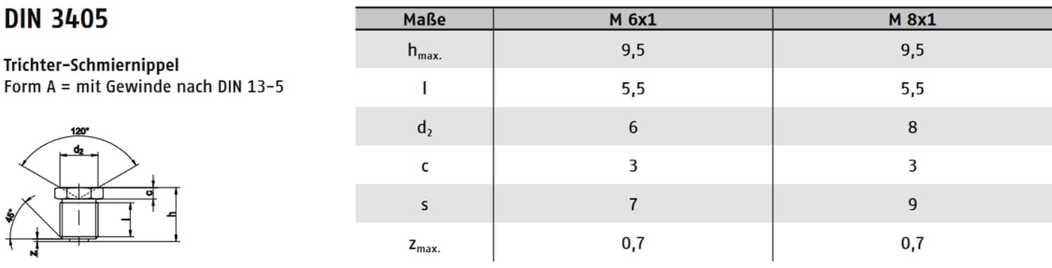 Produziert gemäß DIN 3405, welche insbesondere Trichter- bzw. Kegel-Schmiernippel mit flacher Bauform normiert. Verlässliche Maß- und Gewindetoleranzen stellen eine sichere Funktion und Montagequalität sicher. :contentReference[oaicite:1]{index=1}