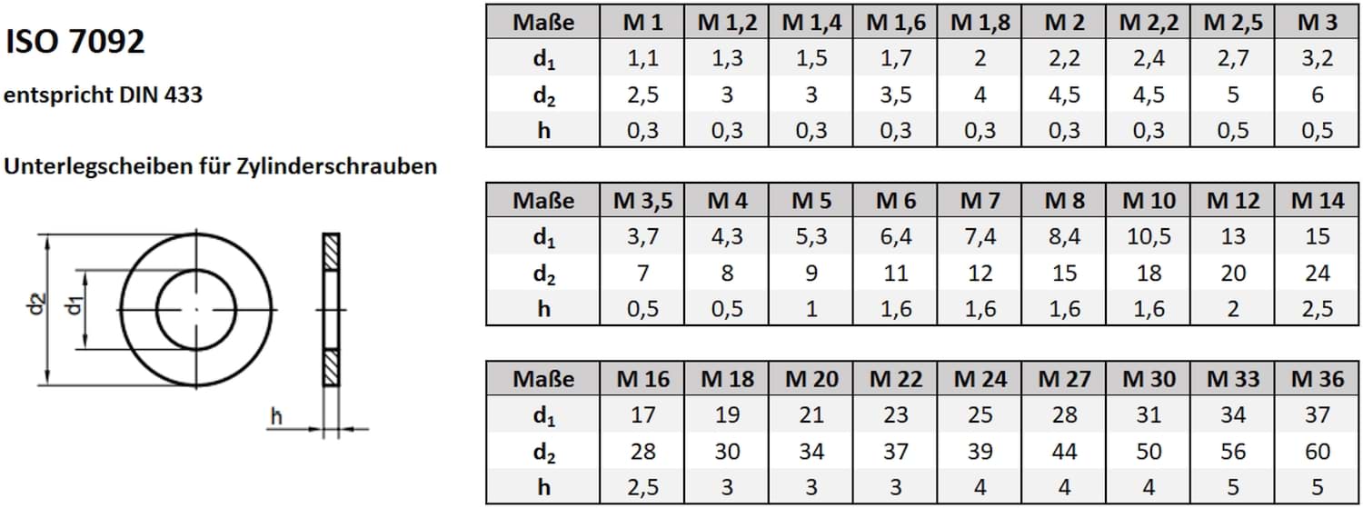 - DIN 433 ➤ Unterlegscheiben für Zylinderschrauben (ISO 7092)