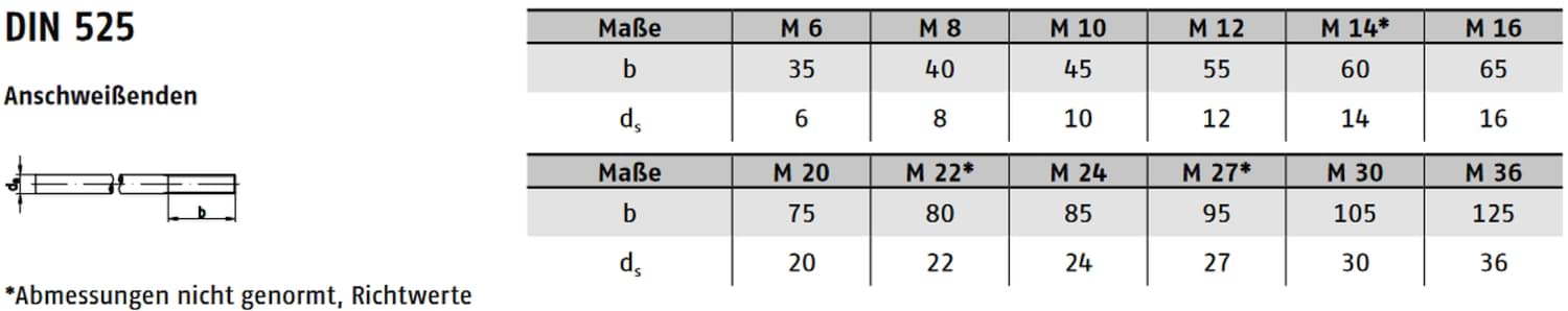 DIN 525 definiert Maße, Form und Gewindegrößen für Anschweißenden, sodass sie untereinander austauschbar und normgerecht einsetzbar sind. Die Norm gewährleistet eine gleichbleibend hohe Qualität und sichere Passung in technischen Konstruktionen.