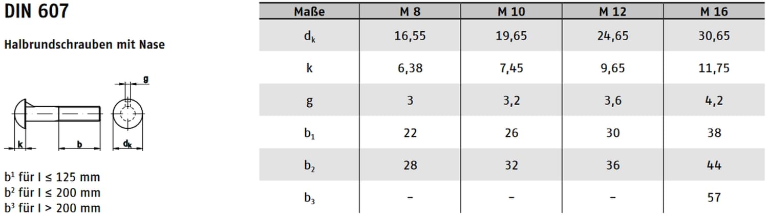 DIN 607 definiert die Kopfgeometrie, die Form und Position der Nase sowie die Gewindeabmessungen dieser speziellen Halbrundschrauben. Die Norm sorgt für Präzision, Austauschbarkeit und gleichbleibende Qualität in allen technischen Anwendungen.