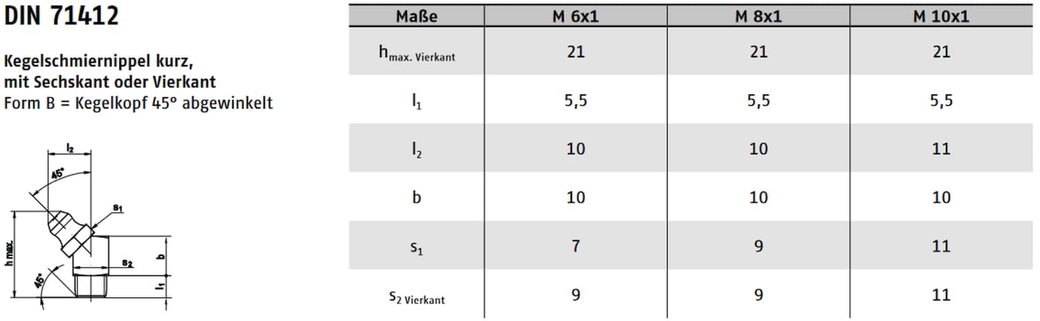 DIN 71412 – Sechskant-Schmiernippel (Form B – 45°, Stahl verzinkt) – platzsparende, robuste Schmierlösung für schwer zugängliche industrielle Wartungsstellen.