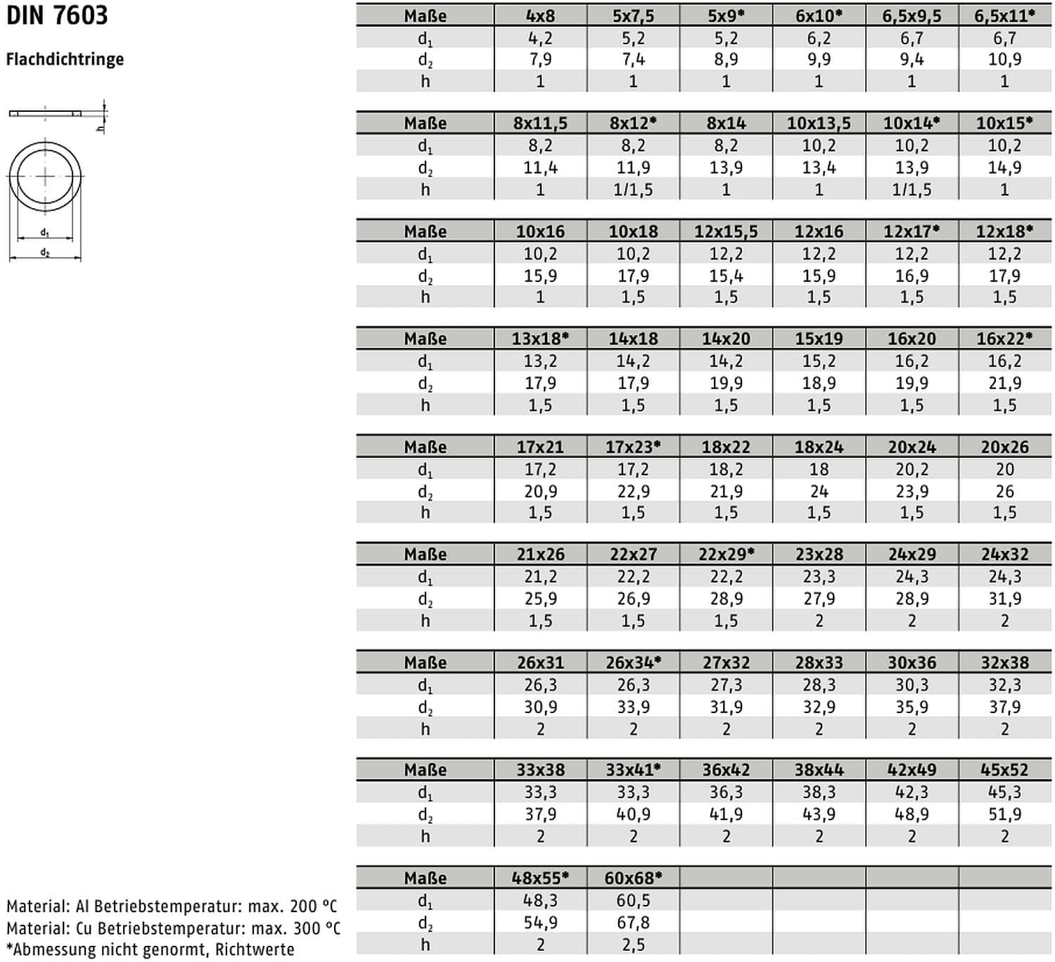 Die DIN 7603 legt die Abmessungen, Toleranzen und Ausführungen für Dichtringe fest. Sie standardisiert Materialstärken und Durchmesser, um sichere und reproduzierbare Abdichtleistungen in industriellen Systemen zu gewährleisten. Aluminium (Form A) ist die klassische Variante für hohe Verformbarkeit und zuverlässige Dichteigenschaften.