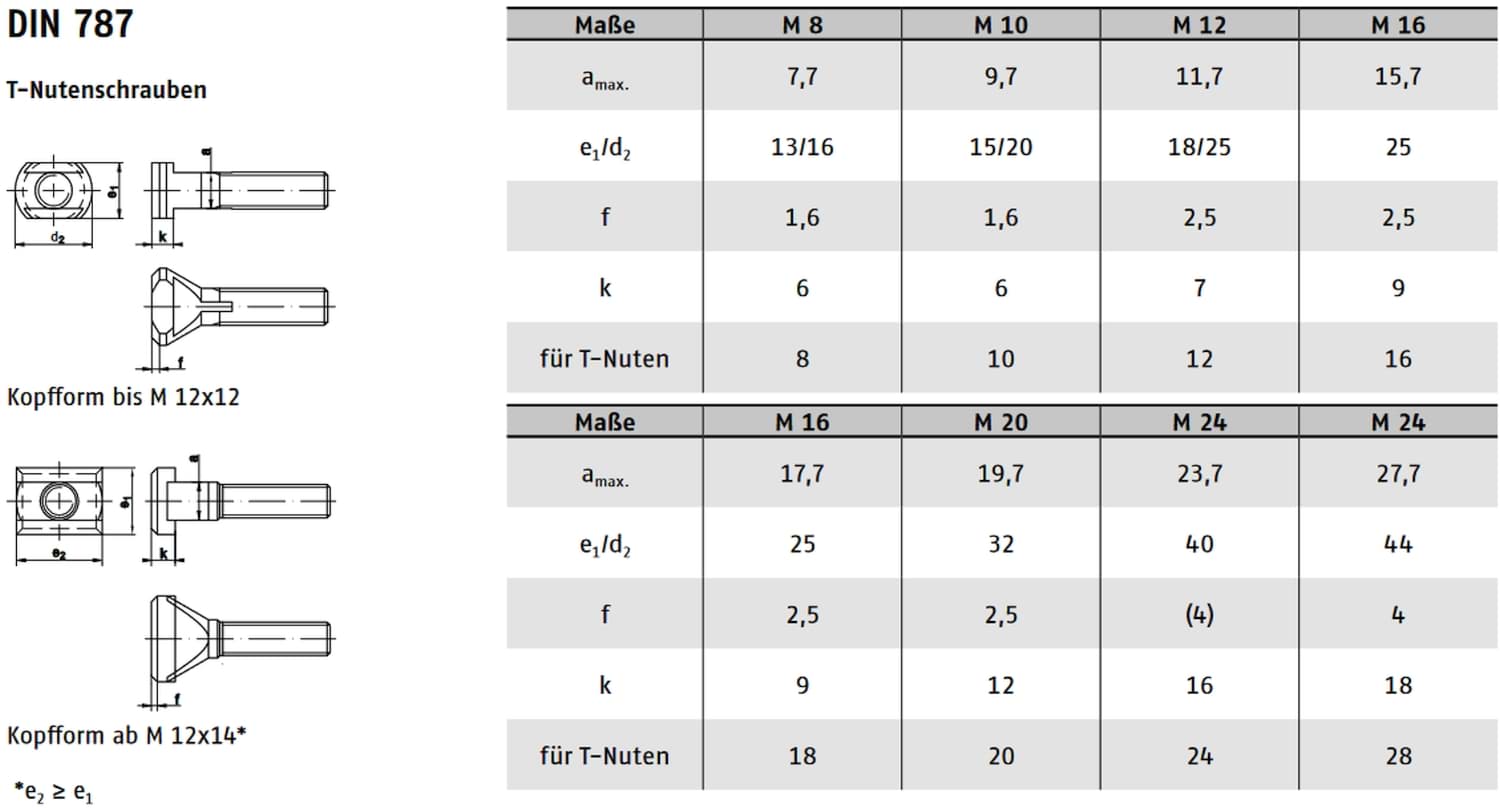 DIN 787 definiert Kopfmaße, Gewindelängen und T-Nutkompatibilität. Dadurch ist eine exakte Passform und Austauschbarkeit gewährleistet. Die Norm gehört zu den wichtigsten Grundlagen in Spann- und Vorrichtungstechnik.