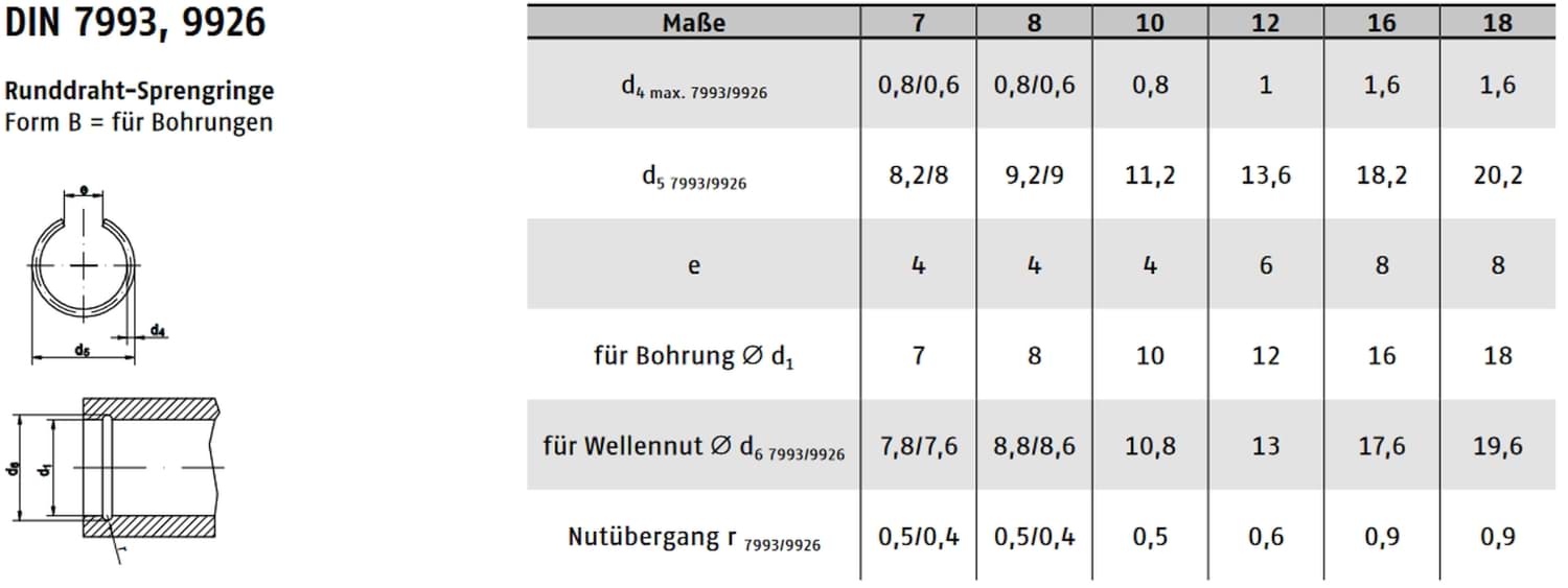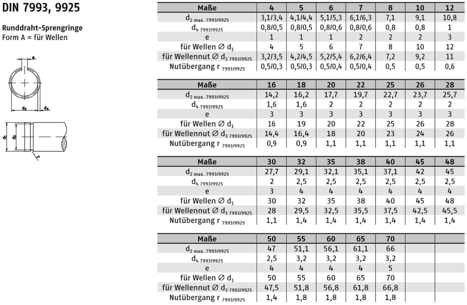 DIN 7993 legt die Abmessungen und Bauformen von Runddraht-Sprengringen fest. Die Norm gewährleistet eine passgenaue Montage in genormten Nuten und eine zuverlässige Sicherungsfunktion.