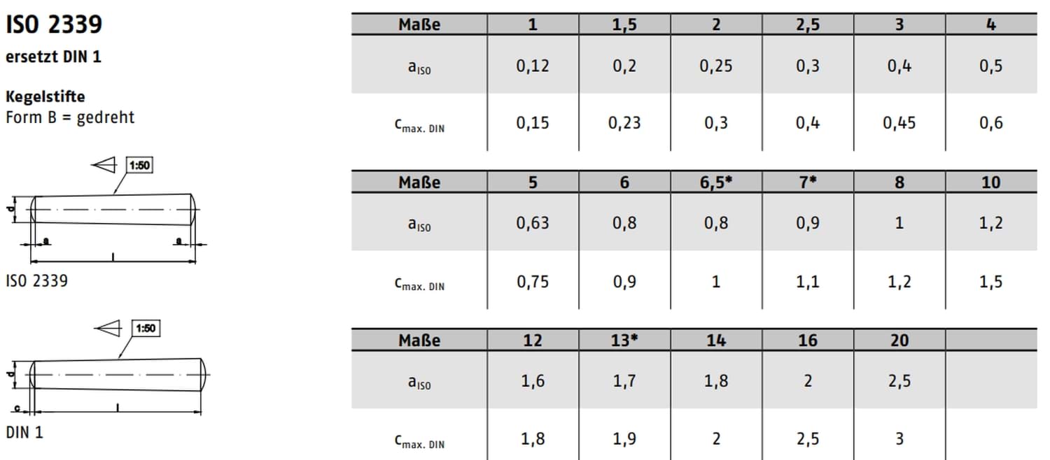Die DIN 1 ist die nationale Norm für Kegelstifte und entspricht der internationalen ISO 2339. Beide Normen definieren die geometrischen und funktionalen Anforderungen an Kegelstifte für zuverlässige mechanische Verbindungen. Die Edelstahlvarianten erfüllen die Qualitätsstandards nach aktuellen Normvorgaben.