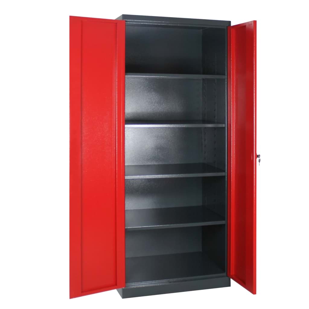 Der Schrank besteht aus hochwertigem Stahlblech und ist pulverbeschichtet in RAL 7016 (Anthrazitgrau) für den Korpus sowie RAL 3000 (Feuerrot) für die Türen. Die widerstandsfähige Oberfläche ist kratzfest, korrosionsbeständig und für den dauerhaften Einsatz im Industriealltag ausgelegt.