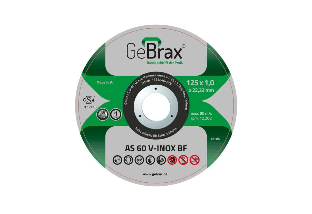 Die GeBrax Trennscheiben (Gruppe: Scheiben) trennen schnell, sicher, gratarm und sehr präzise – ideal für dünnwandige Werkstücke, Bleche, Rohre und Profile. Form: gerade • Dicke: 1,0 mm • Typ: A60S • Ø/Bohrung/max. U/min: 125 mm / 22 mm / 12.200. Produktdatenblatt (Stand 11/2020) · Schnittgeschwindigkeiten