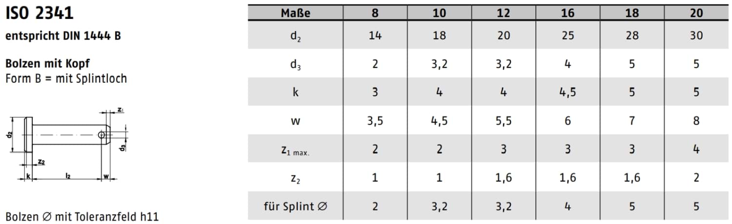 DIN 1444 definiert Maß, Kopfform, Toleranzen und Querbohrungsposition für Splintbolzen. Die verzinkte Stahl-Ausführung erfüllt die Anforderungen für korrosionsgeschützte, robuste und zuverlässige Lagerbolzen im industriellen Einsatz.