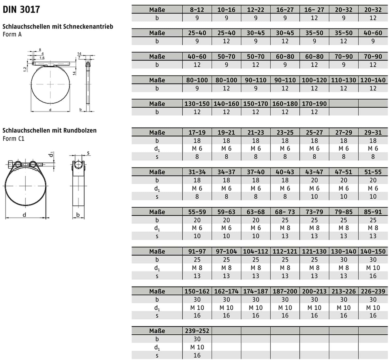 Schlauchschellen nach DIN 3017 werden mittels Schraubmechanismus gespannt, der den Schlauch sicher auf seinem Anschluss fixiert. Die Form A zeichnet sich durch eine klassische, robuste Bauform aus, die festen Halt auch unter Belastung sicherstellt.
