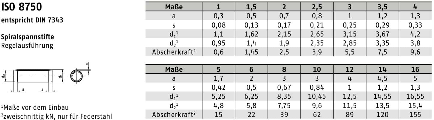 Die DIN 7343 definiert Geometrie, Durchmesser, Toleranzen und Materialanforderungen für Spiralspannstifte. Federstahl 1.4310 erfüllt die hohen Anforderungen an Korrosionsbeständigkeit und Federwirkung und wird bevorzugt eingesetzt, wenn herkömmliche Spannstifte aus unlegiertem Stahl an ihre Grenzen stoßen.