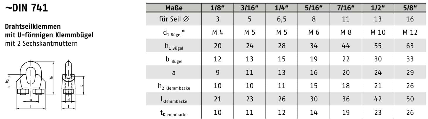 Drahtseilklemmen nach DIN 741 bestehen aus einem Bügel und einer geriffelten Klemmschale. Die Schrauben pressen Seil und Klemme fest zusammen, wodurch eine stabile, nicht rutschende Verbindung entsteht – ideal für Seilschlaufen und Fixierungen.
