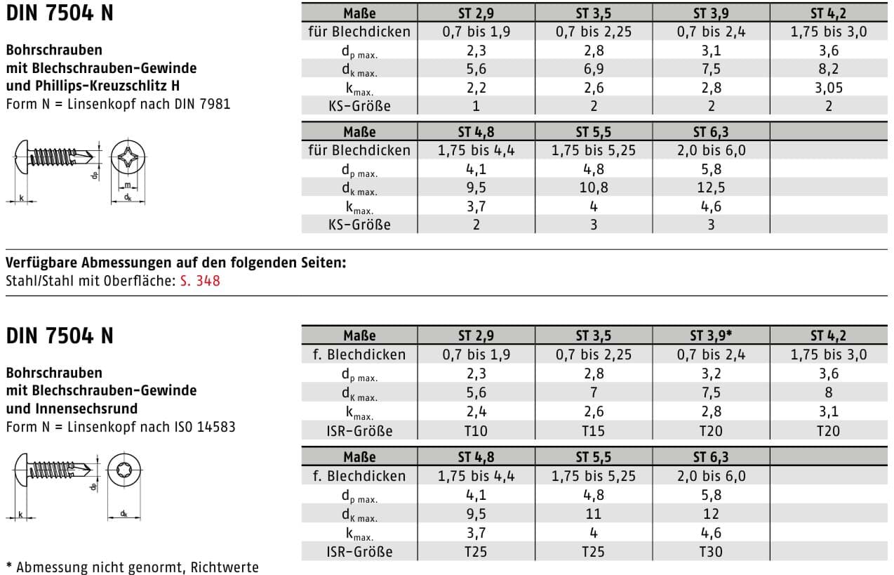 Die DIN 7504 N definiert Kopfform, Materialeigenschaften und Funktionsweise für Bohrschrauben mit Linsensenkkopf. Die Ergänzung mit TX-Antrieb folgt modernen Anforderungen an sicheren Kraftschluss und Montagequalität.