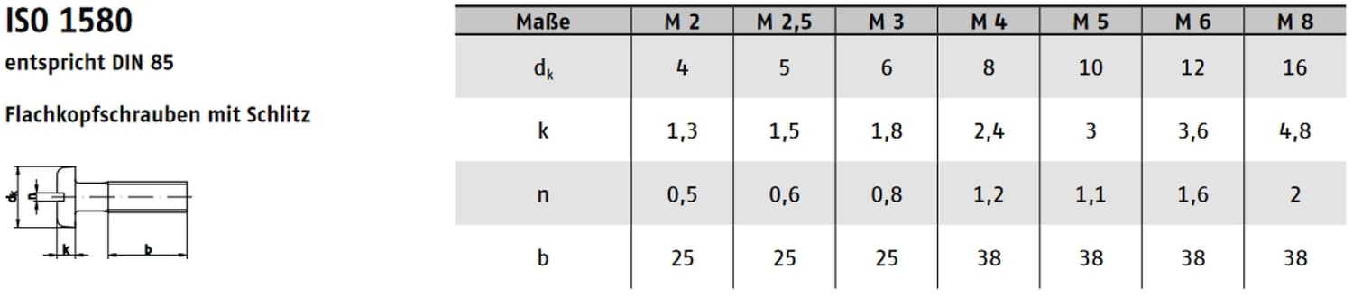 DIN 85 Flachkopfschrauben mit Schlitz aus galvanisch verzinktem Stahl – der bewährte Standard für flache Schlitzverschraubungen mit Grundkorrosionsschutz.