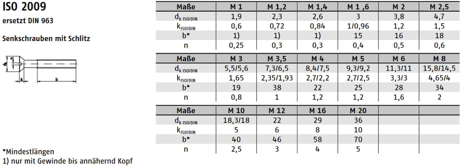DIN 963 definiert Abmessungen, Kopfwinkel, Kopfhöhen und Gewindelängen von Senkschrauben mit Schlitz und metrischem Gewinde. Die Norm stellt sicher, dass Schrauben unterschiedlicher Hersteller austauschbar sind und in vorhandene Konstruktionen normgerecht passen.