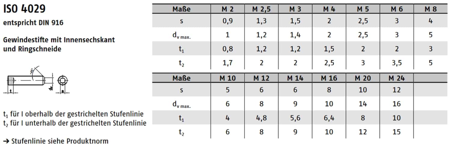 ISO 4029 entspricht in weiten Teilen der früheren DIN 916. Beide Normen definieren Abmessungen, Härtebereiche und Toleranzen für Gewindestifte mit Innensechskant und Ringschneide. In der Praxis sind ISO 4029 und DIN 916 meist austauschbar, sofern Werkstoff und Härteanforderungen übereinstimmen.