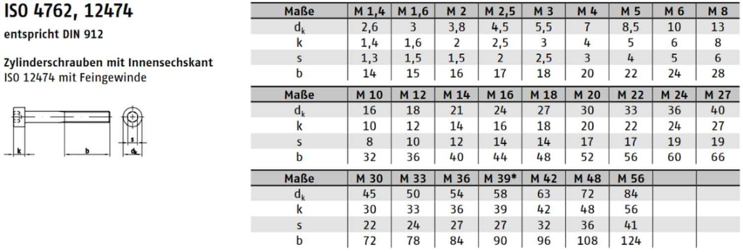 ISO 4762 legt Maße, Kopfhöhen, Schlüsselweiten und Toleranzen für Zylinderschrauben mit Innensechskant fest. Sie entspricht weitgehend der früheren DIN 912 und ist heute die international gültige Standardnorm. Dadurch sind Schrauben unterschiedlicher Hersteller untereinander austauschbar und mit genormten Muttern und Gewinden kombinierbar.