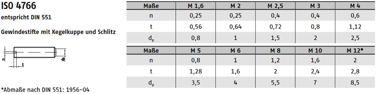 Produktion gemäß ISO 4766, der international gültigen Norm für Gewindestifte mit Schlitz. Funktionell ähnlich DIN 551, jedoch global anerkannt und in internationalen Projekten bevorzugt.