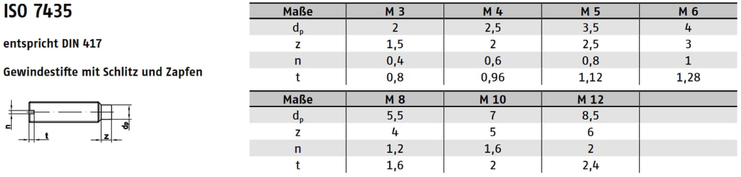 - DIN 417 ➤ Gewindestifte mit Schlitz & Zapfen (ISO 7435)
