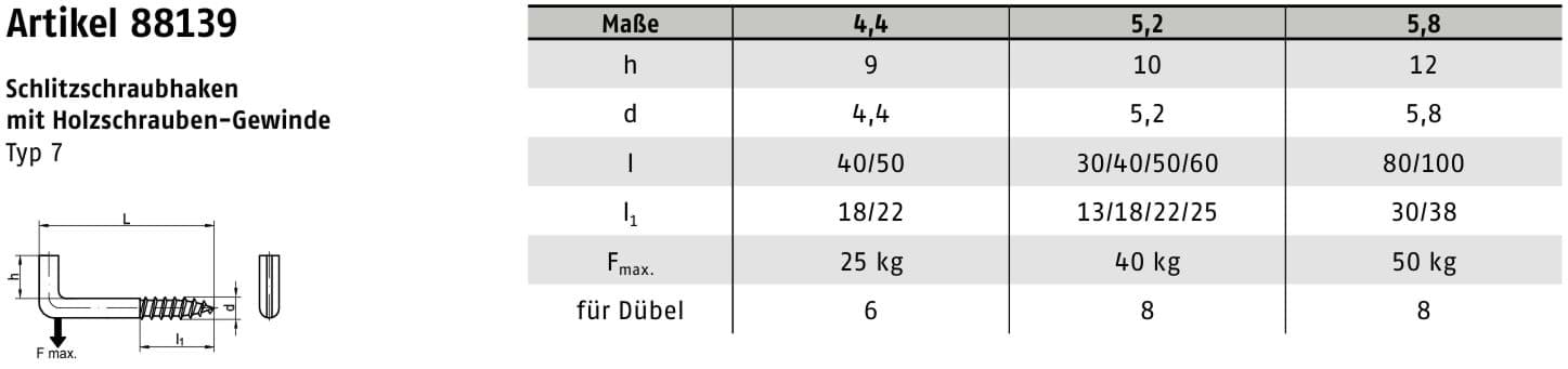 Der Schraubhaken entspricht der Ausführung ART 88139 (Typ 7) und wird nach gängigen Qualitätsstandards gefertigt. Die angegebenen Belastungswerte gelten bei fachgerechter Montage.