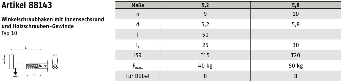 Der Winkelschraubhaken ART 88143 ist ein stabil ausgeführter Schraubhaken mit Holzschraubengewinde und Innensechsrund-Antrieb, ausgelegt für belastbare Befestigungen in Holz sowie für die Montage mit Dübeln in Mauerwerk oder Beton.