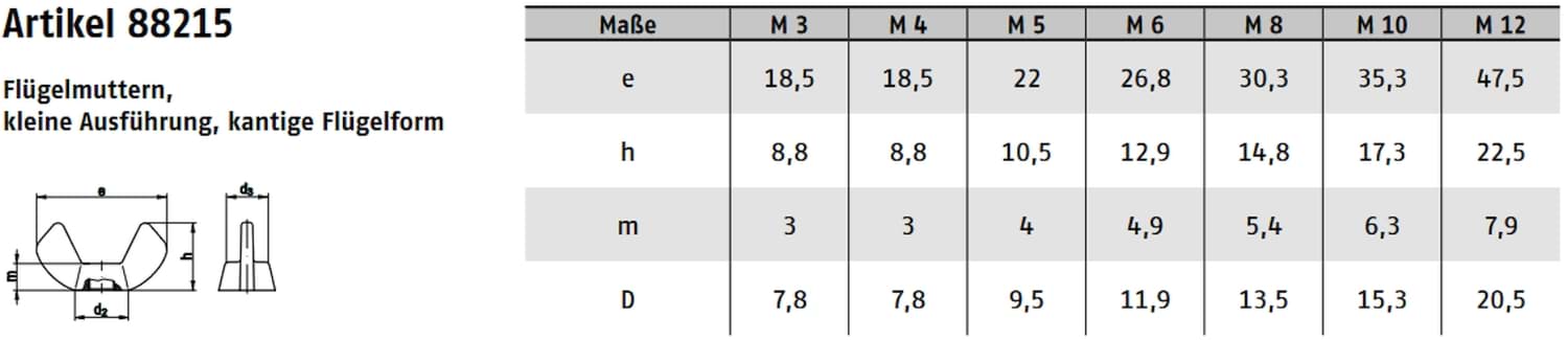 | Gewinde | Flügelweite [a] | Höhe [h] | Material | Oberfläche |
