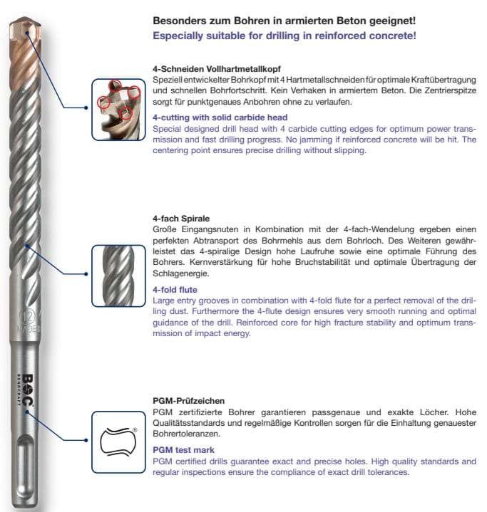 Der Voll-HM-Kopf in 4-Schneider-Geometrie bohrt ruhiger, führt besser und bleibt auch bei Bewehrungskontakt formstabil. Zusammen mit der 4-fach Helix entstehen schnelle, zentrische Bohrungen mit langer Lebensdauer des Werkzeugs – ideal für professionelle Anwendungen.
