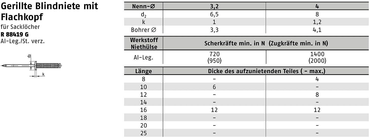 - Typ: Gerillte Blindniete mit Flachkopf