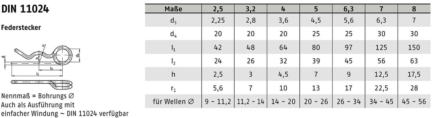 DIN 11024 legt Maße, Form und Federwirkung von Federsteckern fest. Die verzinkte Stahl-Ausführung erfüllt die Anforderungen an funktionssichere, schnell lösbare Sicherungselemente nach Industriestandard.