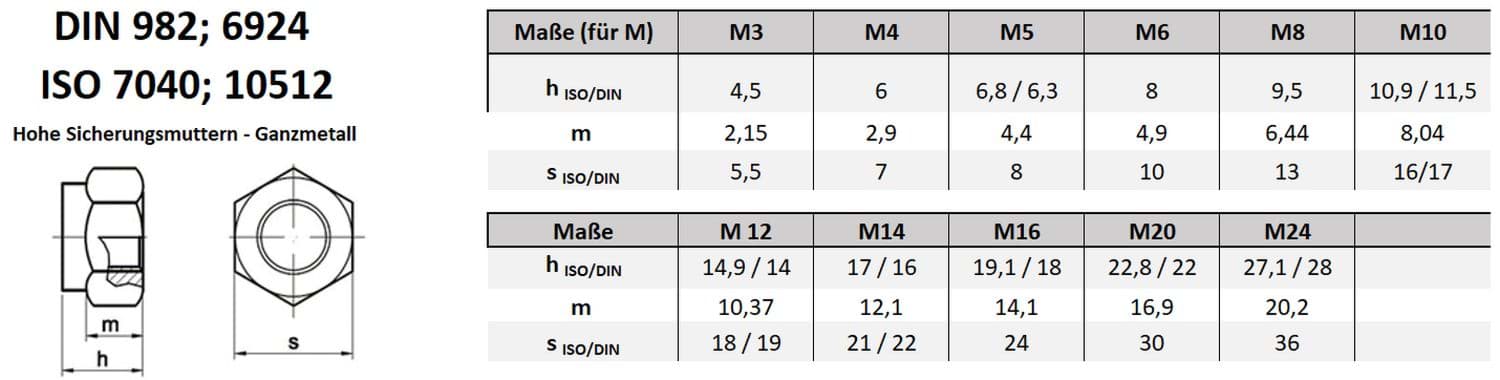 Im Gegensatz zur DIN 982 bietet die DIN 6924 eine höhere Festigkeit (Stahl 10), engere Maßtoleranzen und eine verstärkte Klemmwirkung durch präzisere Fertigung. Sie wird daher in hochbeanspruchten und sicherheitsrelevanten Bereichen bevorzugt.