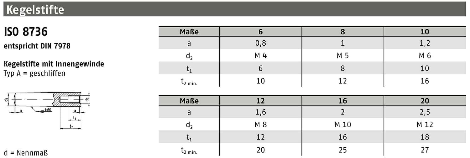 DIN 7978 entspricht der internationalen Norm ISO 8736 und legt Maße, Form und technische Anforderungen für Kegelstifte mit Innengewinde fest. Die Stahlvariante garantiert normgerechte Qualität und hohe Zuverlässigkeit für präzise technische Konstruktionen.