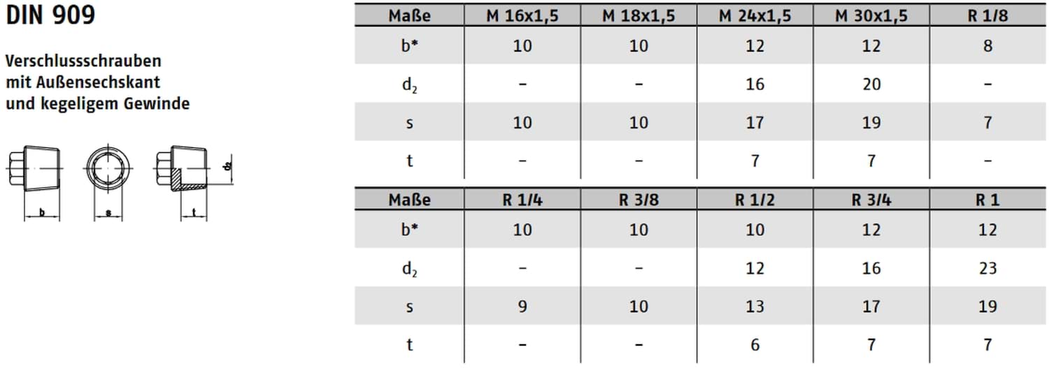DIN 909 legt die Maße, Gewindeformen, den Kegelwinkel und die Form des Außensechskants fest. Die Norm stellt sicher, dass die Verschlussschrauben druckfest, austauschbar und für sicherheitsrelevante Systeme geeignet sind.