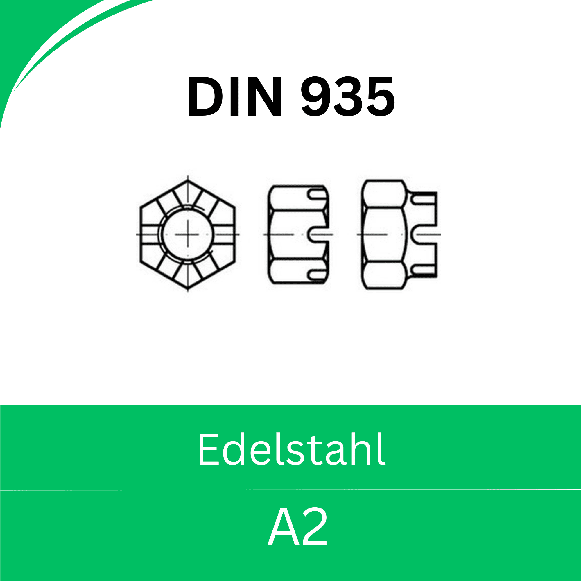 Norm: DIN 935 – Kronenmuttern mit Splintsicherung. Werkstoff: Edelstahl A2 (V2A). Mechanische Eigenschaften gemäß DIN EN ISO 3506-2. Maß- und Gewindetoleranzen nach ISO 965-2.
