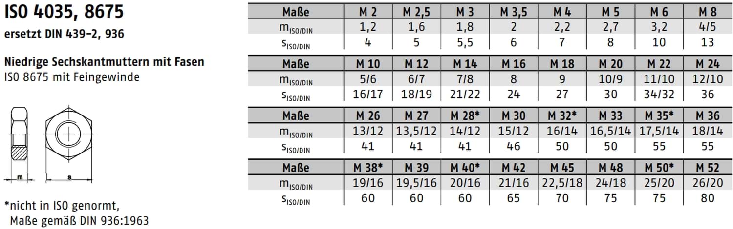 Die niedrige Form nach DIN 936 spart Platz und Gewicht, ohne die Festigkeit der Verbindung zu beeinträchtigen. Perfekt für kompakte Baugruppen und rostfreie Schraubverbindungen.