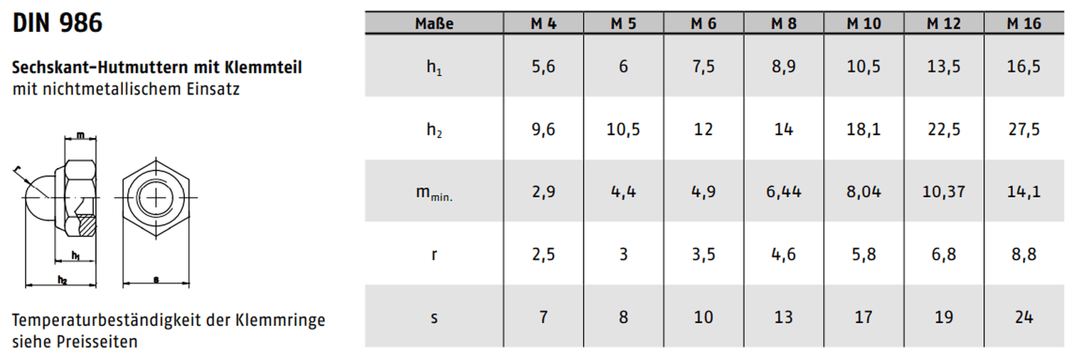 Norm: DIN 986 – Sicherungshutmutter mit nichtmetallischem Einsatz.