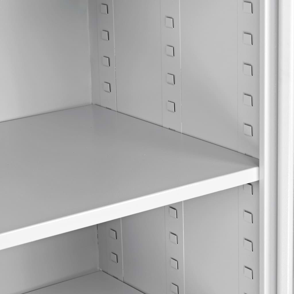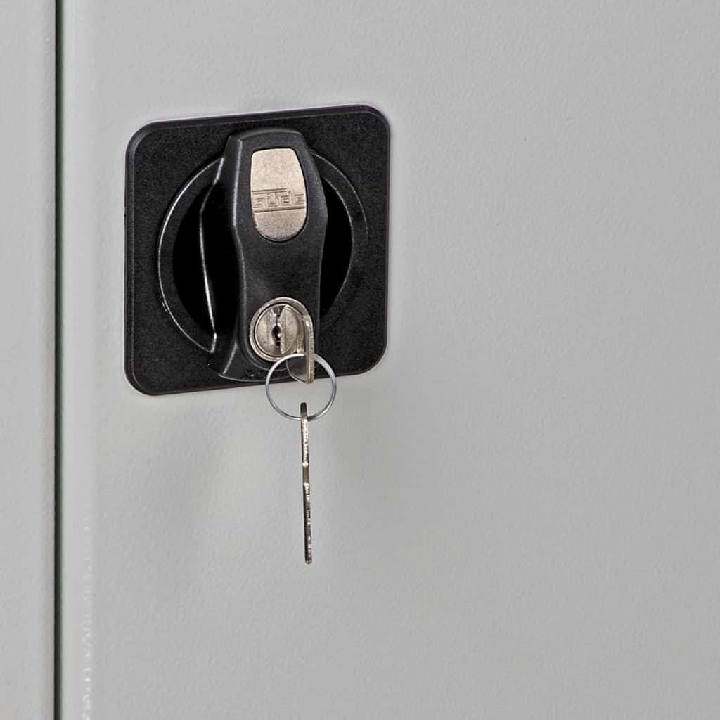 Der Schrankkorpus besteht aus hochwertigem Stahlblech und ist pulverbeschichtet in RAL 7035 (Lichtgrau). Die Oberfläche ist kratzfest, pflegeleicht und für den dauerhaften Einsatz im Industrie- und Betriebsalltag ausgelegt. Die stabile Konstruktion gewährleistet Formstabilität auch bei hoher Belastung.