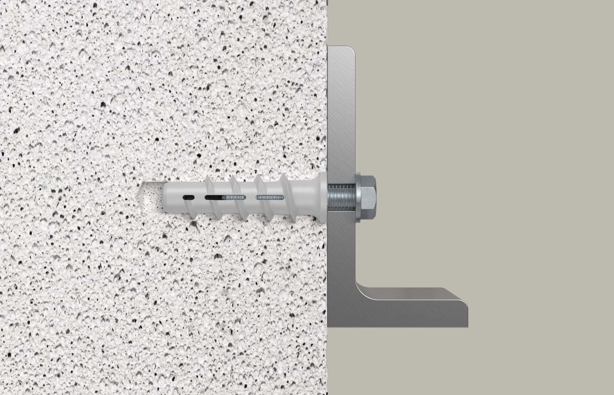 Vorteile: Der FTP K ist für Holz- und metrische Schrauben geeignet und erlaubt dadurch eine flexible Schraubenauswahl. Das spiralförmige Außengewinde schneidet sich formschlüssig in den Porenbeton und sorgt für sicheren Halt. Die Setzung mit dem Setzwerkzeug FTP EK erfordert nur geringen Kraftaufwand und erleichtert die Montage. Die besondere Geometrie verankert nahezu spreizdruckfrei – ideal für geringe Rand- und Achsabstände und zur Vermeidung von Abplatzungen an verputzten Oberflächen.