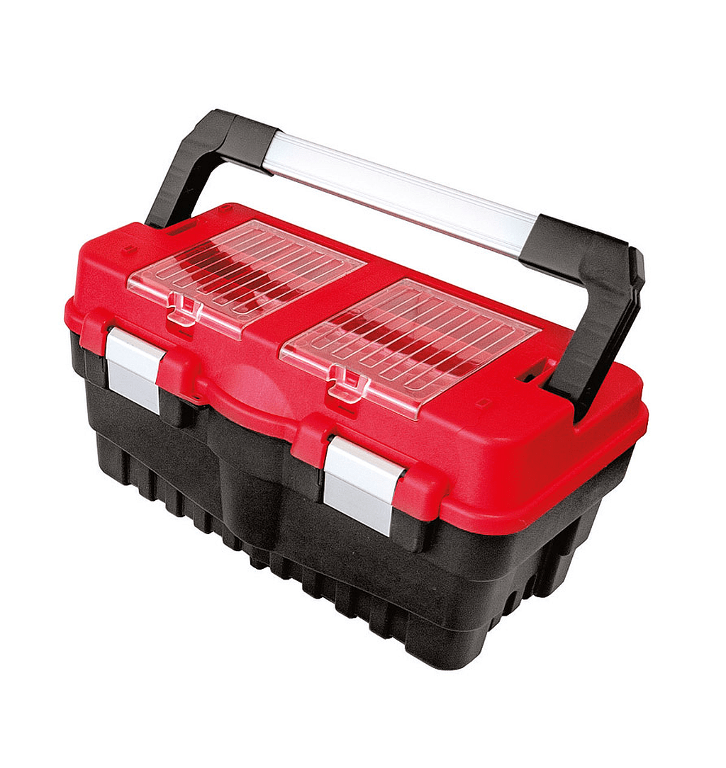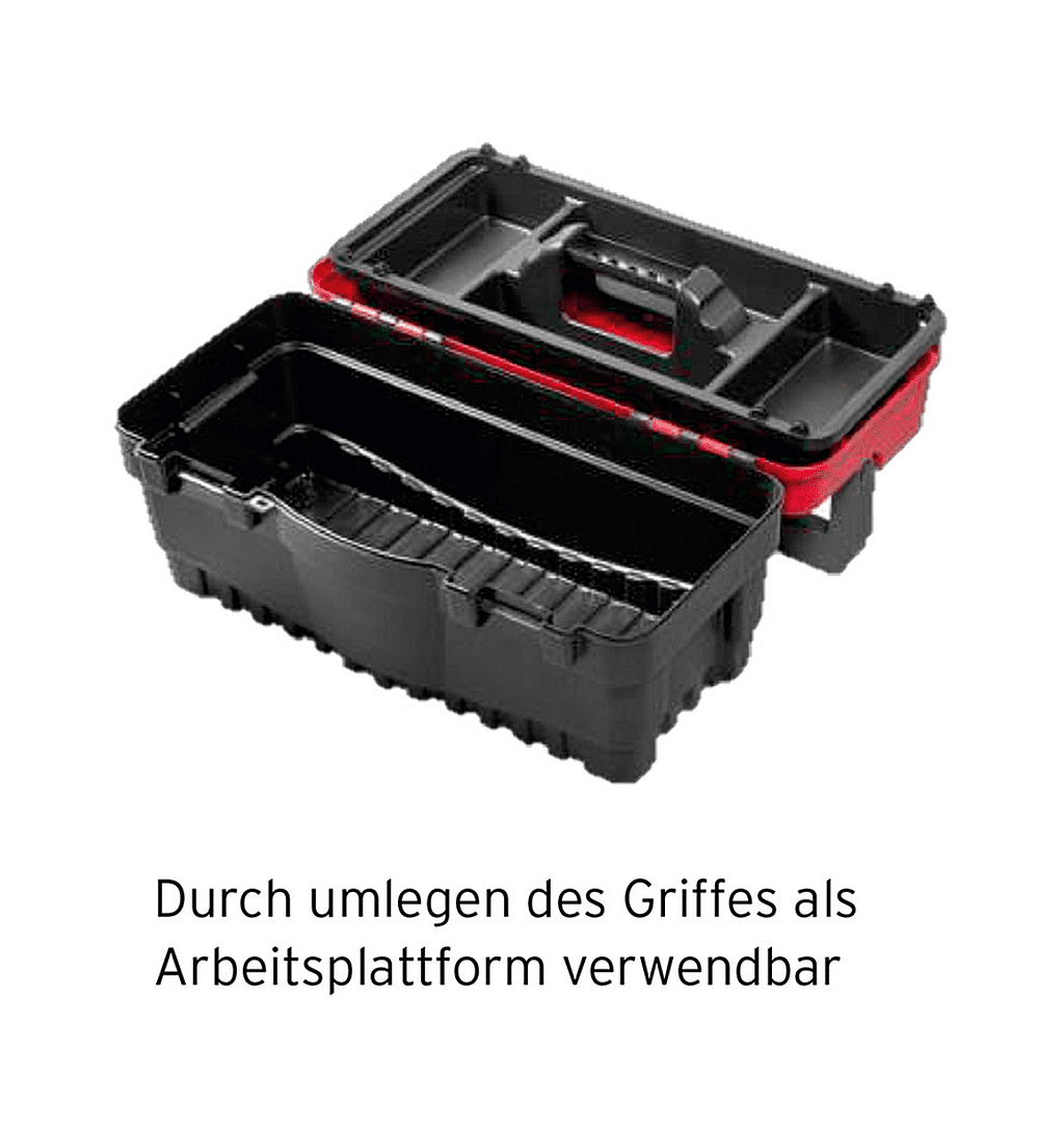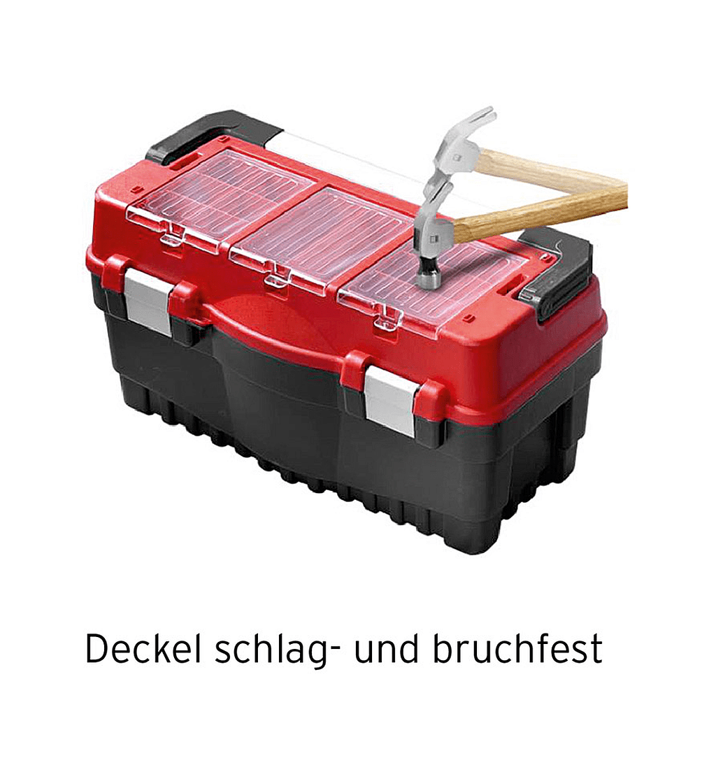 Der Werkzeugkoffer aus hochwertigem Kunststoff bietet eine sichere und übersichtliche Aufbewahrung für Werkzeuge und Zubehör. Mit schlag- und bruchfestem Polycarbonat-Deckel sowie integrierten Kleinteilefächern bleibt alles geschützt und schnell griffbereit – ideal für Baustellen, Werkstatt und mobile Montageeinsätze.